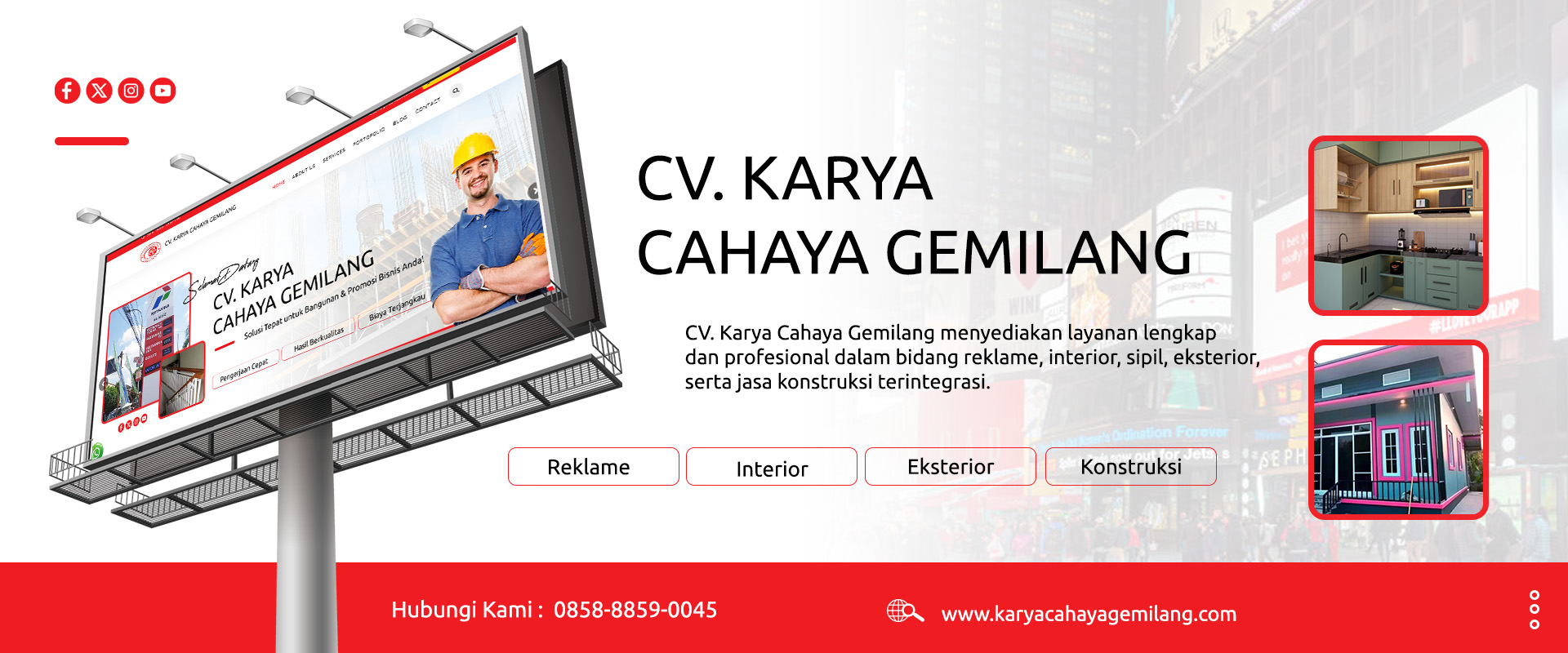 CV. Karya Cahaya Gemilang menyediakan layanan lengkap dan profesional dalam bidang reklame, interior, sipil, eksterior, serta jasa konstruksi terintegrasi. Kami hadir sebagai solusi menyeluruh untuk kebutuhan pembangunan, penataan ruang, dan promosi visual bisnis maupun properti Anda.