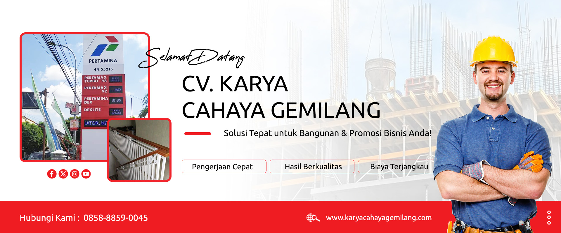 CV. KARYA CAHAYA GEMILANG adalah perusahaan yang bergerak di bidang jasa konstruksi, reklame, interior, eksterior, dan pekerjaan sipil. Kami hadir sebagai solusi lengkap (one stop service) untuk Anda yang membutuhkan layanan desain, pembangunan, hingga pemasangan media promosi visual seperti neon box, billboard, dan signage toko.